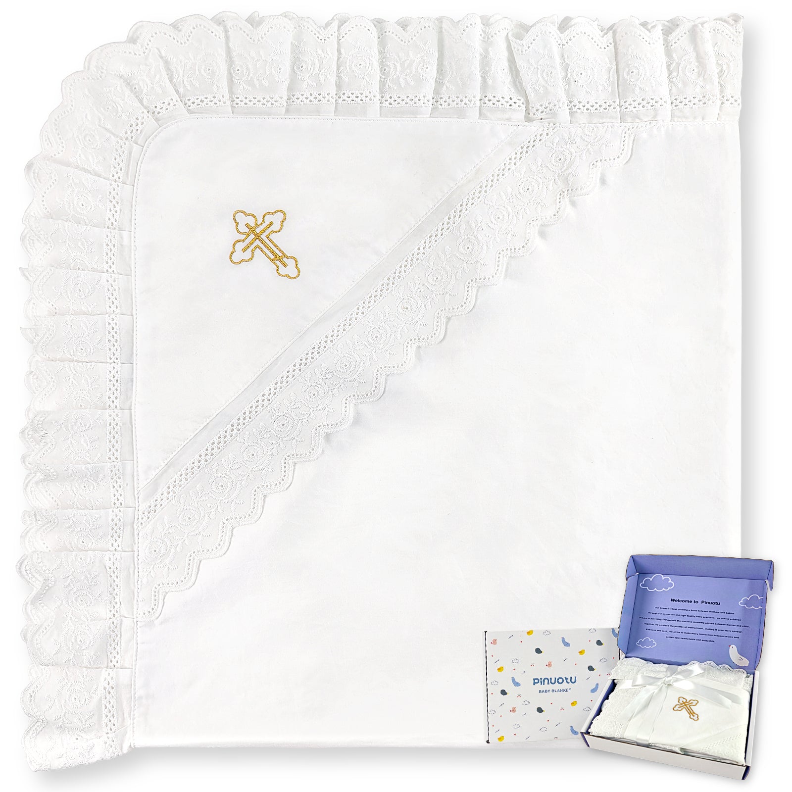 This 100% cotton baptism blanket features a delicate lace trim and gold embroidered cross, adding elegance to your baby’s Christening or baptism. Soft, breathable, and hypoallergenic, it’s perfect for newborns. At 35x40in, it works as a swaddle, stroller blanket, or Christening wrap. Ideal for baby showers and religious gifts, it comes beautifully packaged in a premium gift box.
